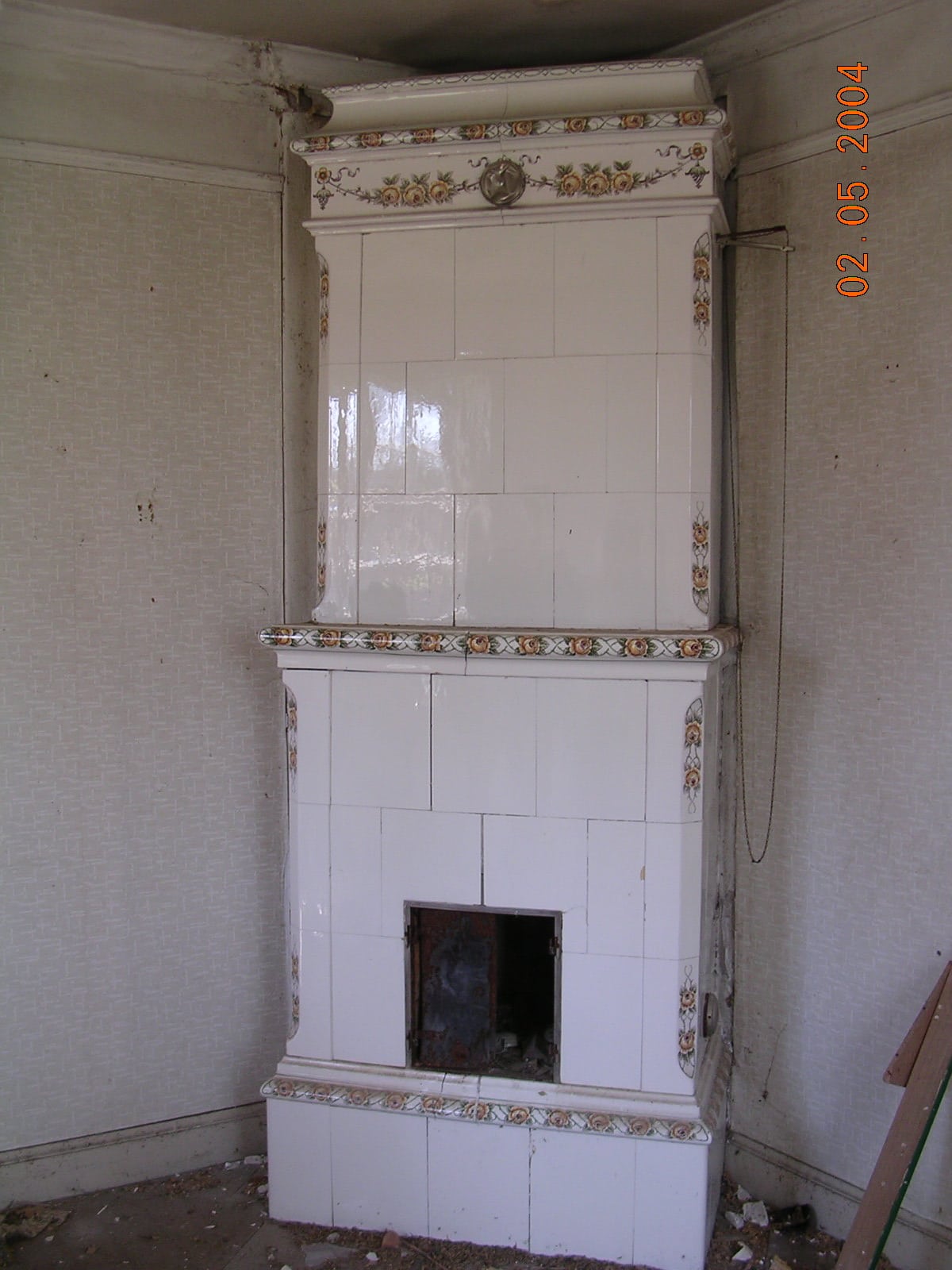 Flat Uppsala Ekeby kakelugn med hylla, vit med trevligt handmålad dekor av rosenknoppar i gult och grönt. Står uppsatt i Uppsala butiken. Från Rättarbostaden Frötuna Gård (se bild)