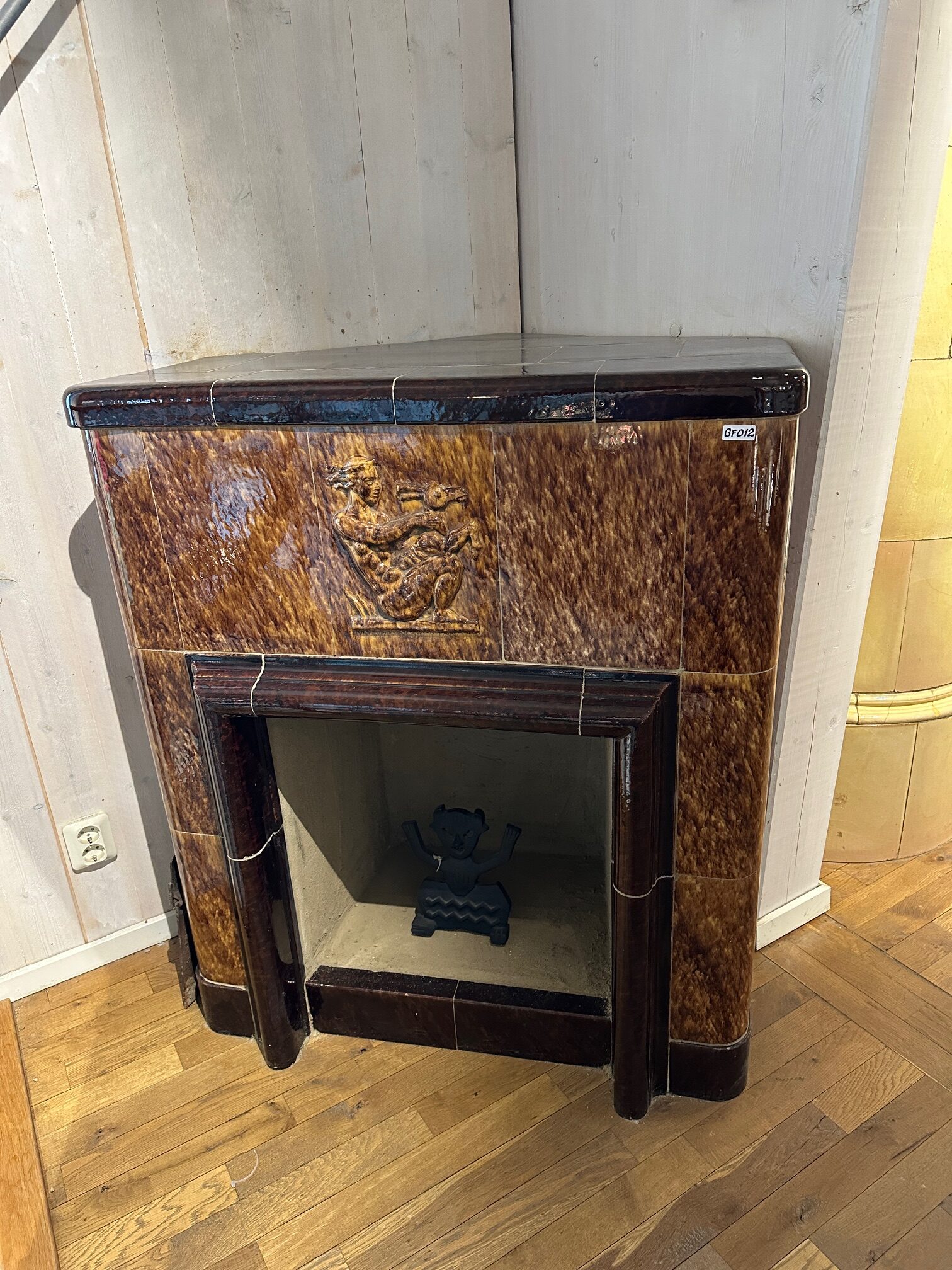 Öppen spis, vackert melerad i bruna toner från Villa Springcorn i Marielund. 20 tals klassicism. Finns uppmurad i utställningen i Uppsala.