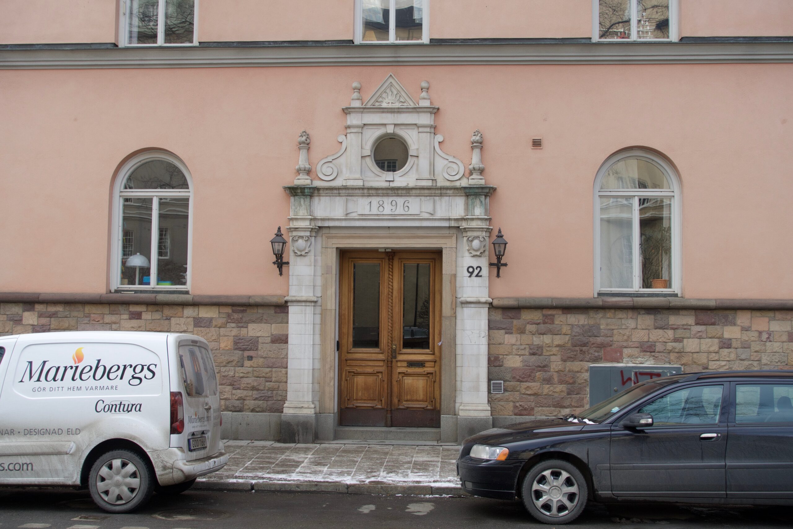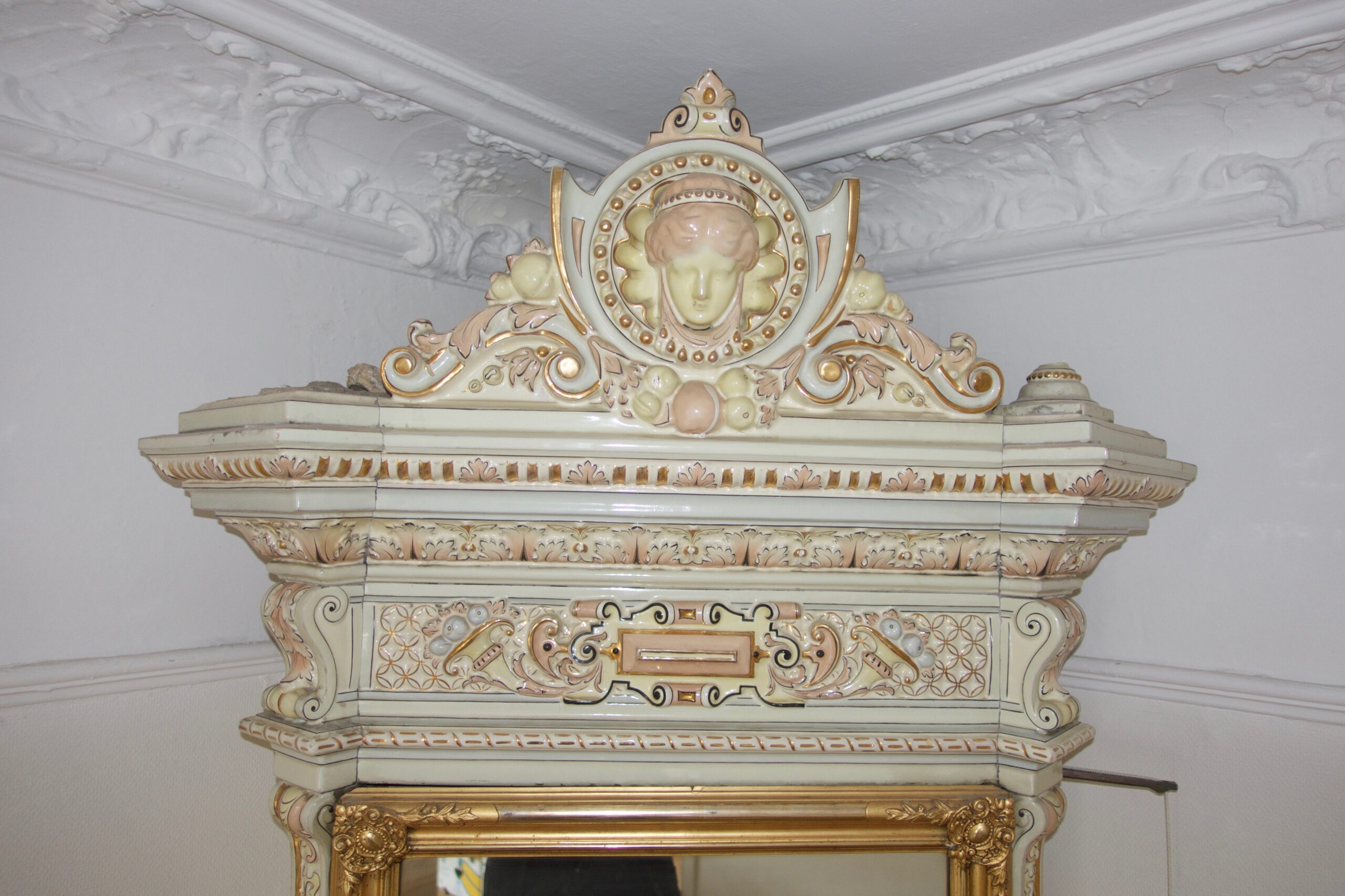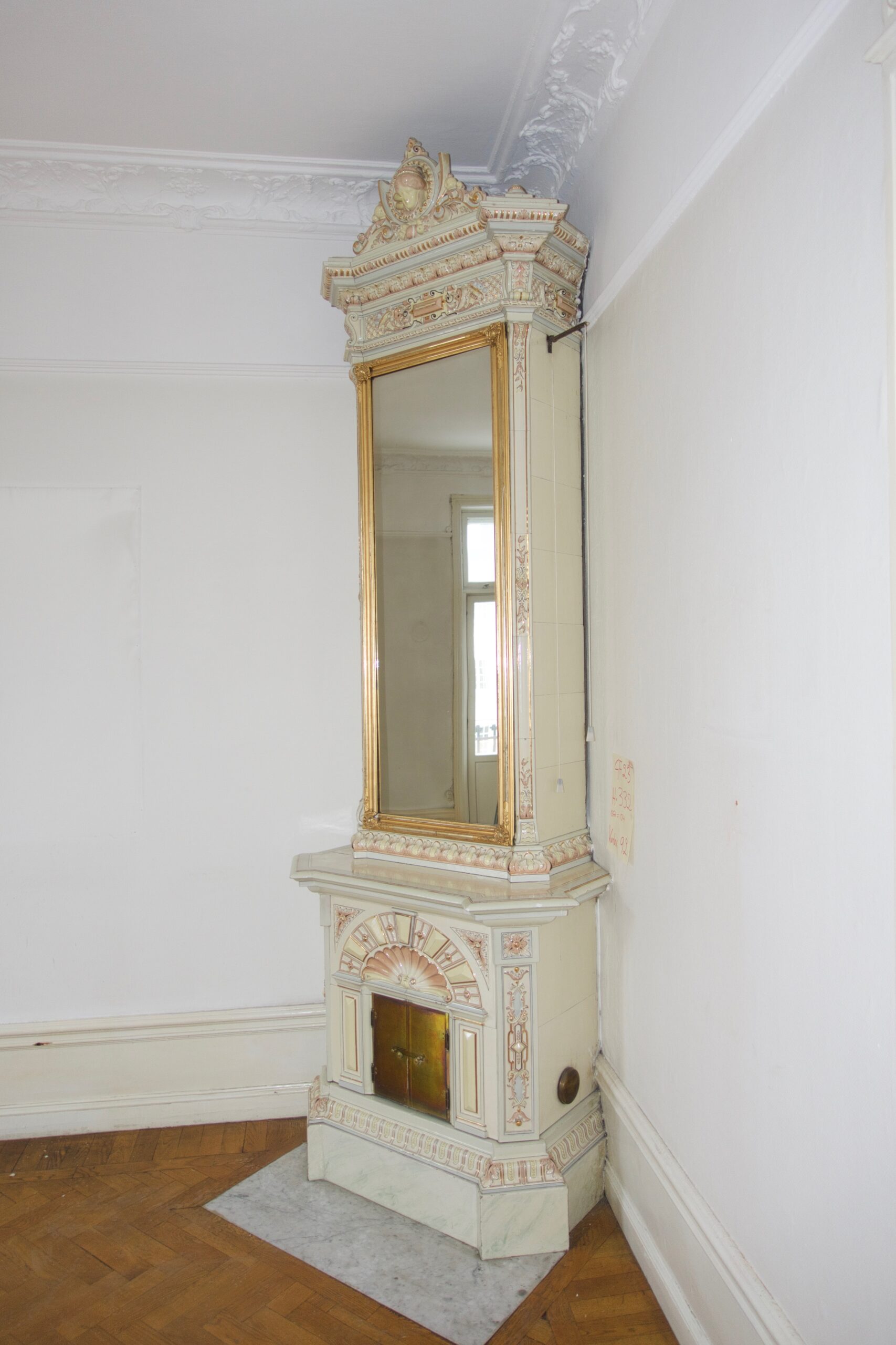 Salongskakelugn med hylla och spegel i original från 1896, 332 hög, Karlavägen 92, Östermalm. Troligen BH Lundgrens fabrik