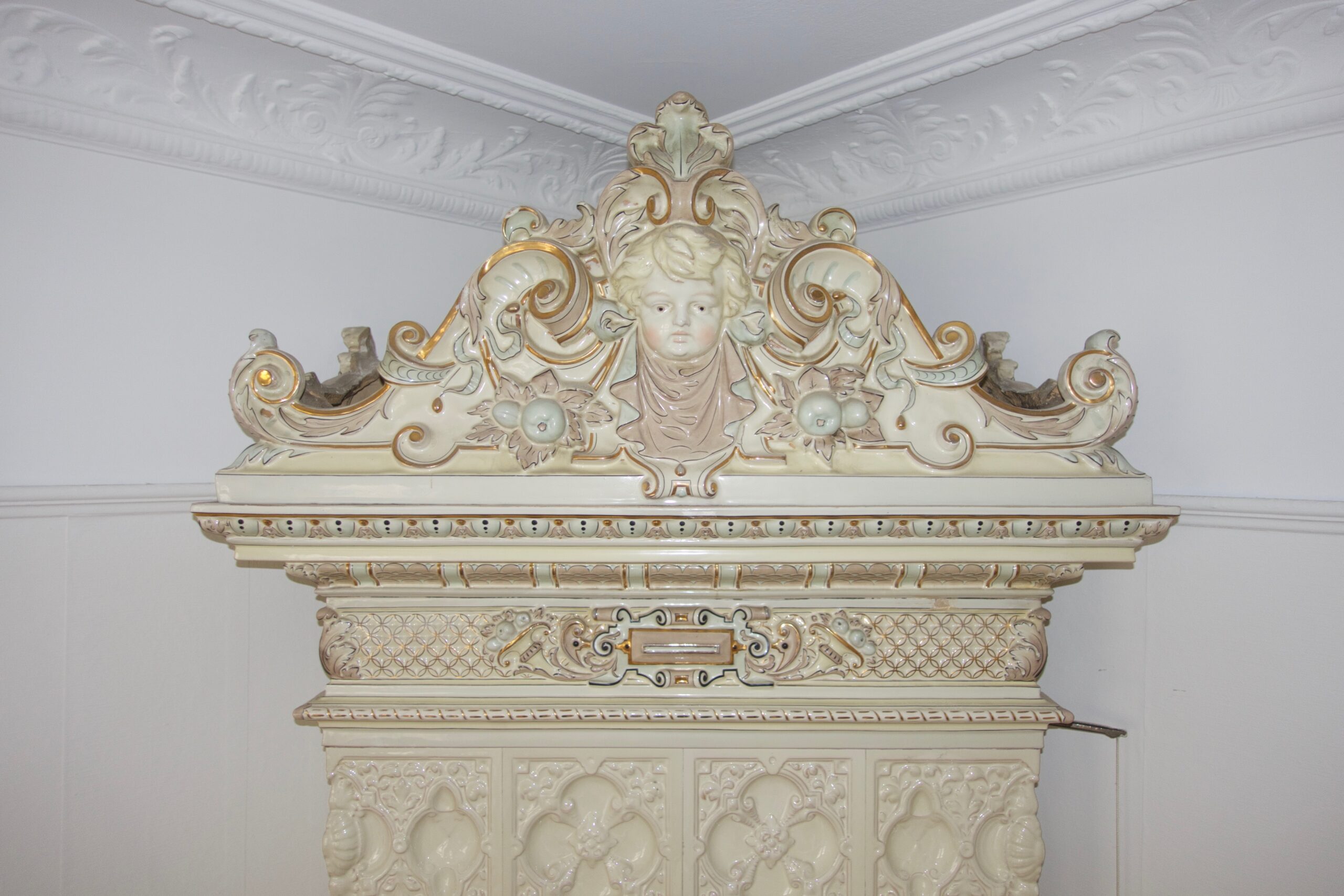 Praktkakelugn från 1896, extra kakel finns sparade så att den kan byggas tillbaka i originalskick vid luckan. Har stått i salen i våning på Karlavägen 92, Östermalm. Troligen BH Lundgrens fabrik, Stockholm