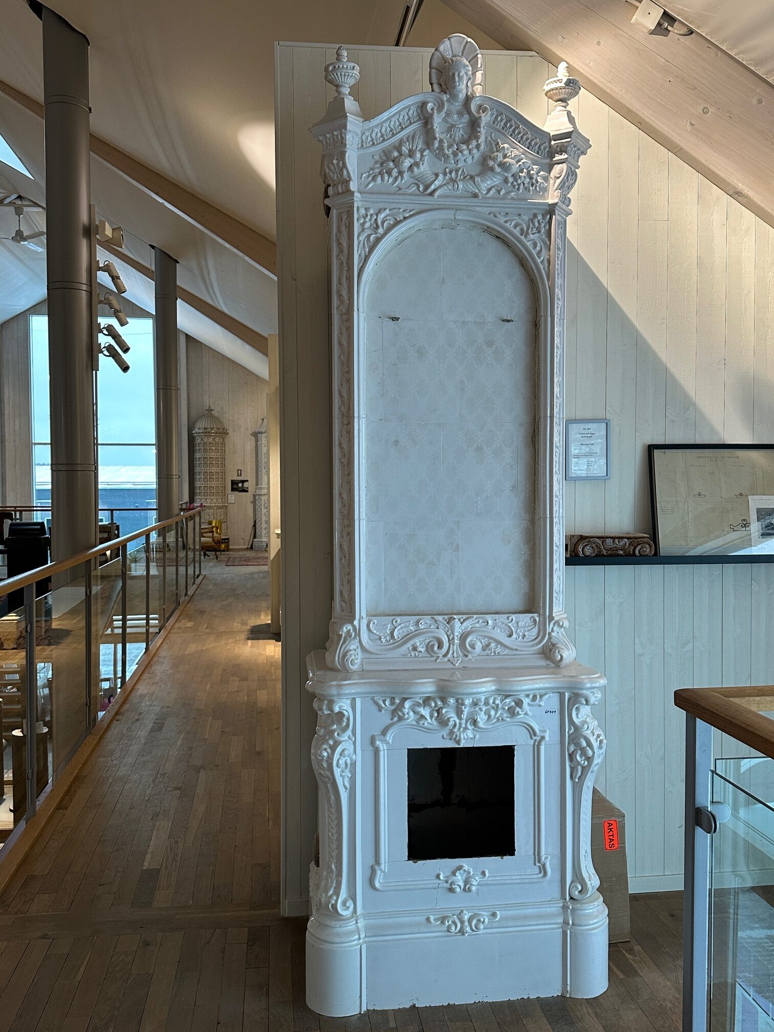 Helvit kakelugn med hylla och spegel. Tillverkad 1890 i tidstypisk stil, nyrenässans. Nedtagen i Djursholm i samband med ombyggnad. Finns nu uppsatt i Utställningen i Uppsala.