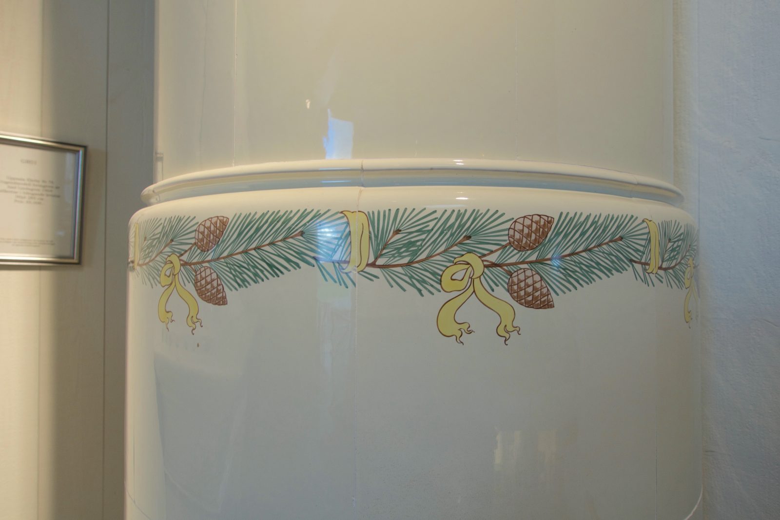 GR001, mycket tilltalande kakelugn i tidstypisk jugendstil, perfekt skick, ca 1905 Ekeby nr 76 med tallkottar och tallkvistar, cremefärgad glacyr. Står uppmurad i utställningen i Uppsala.