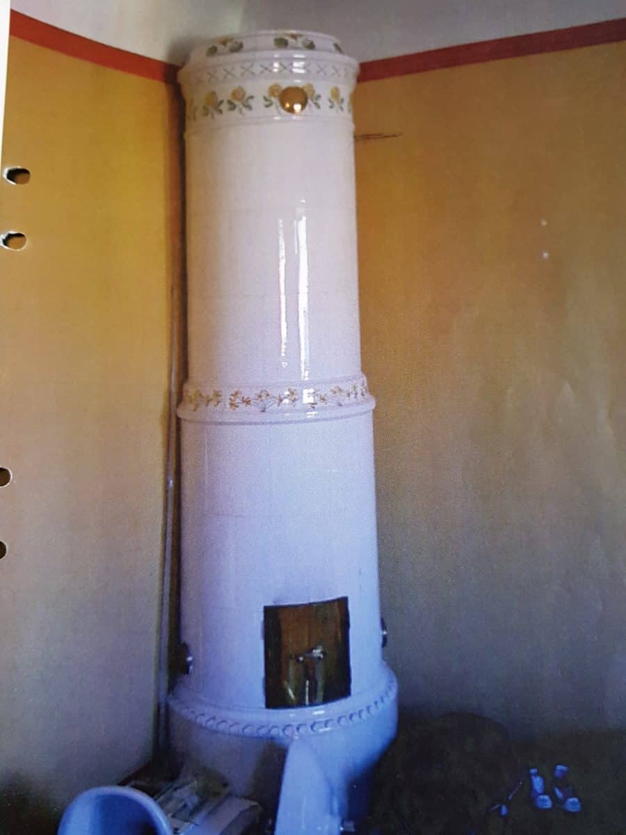 Vit kakelugn med gula rosor i krönet och rosenknoppar på mittbandet. Ca 1905, har stått vid Odenplan, Stockholm