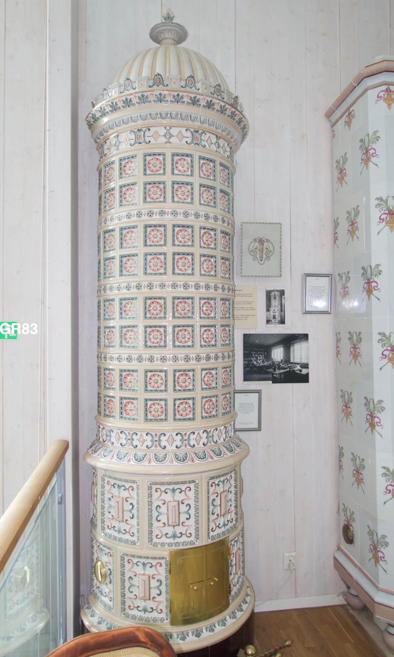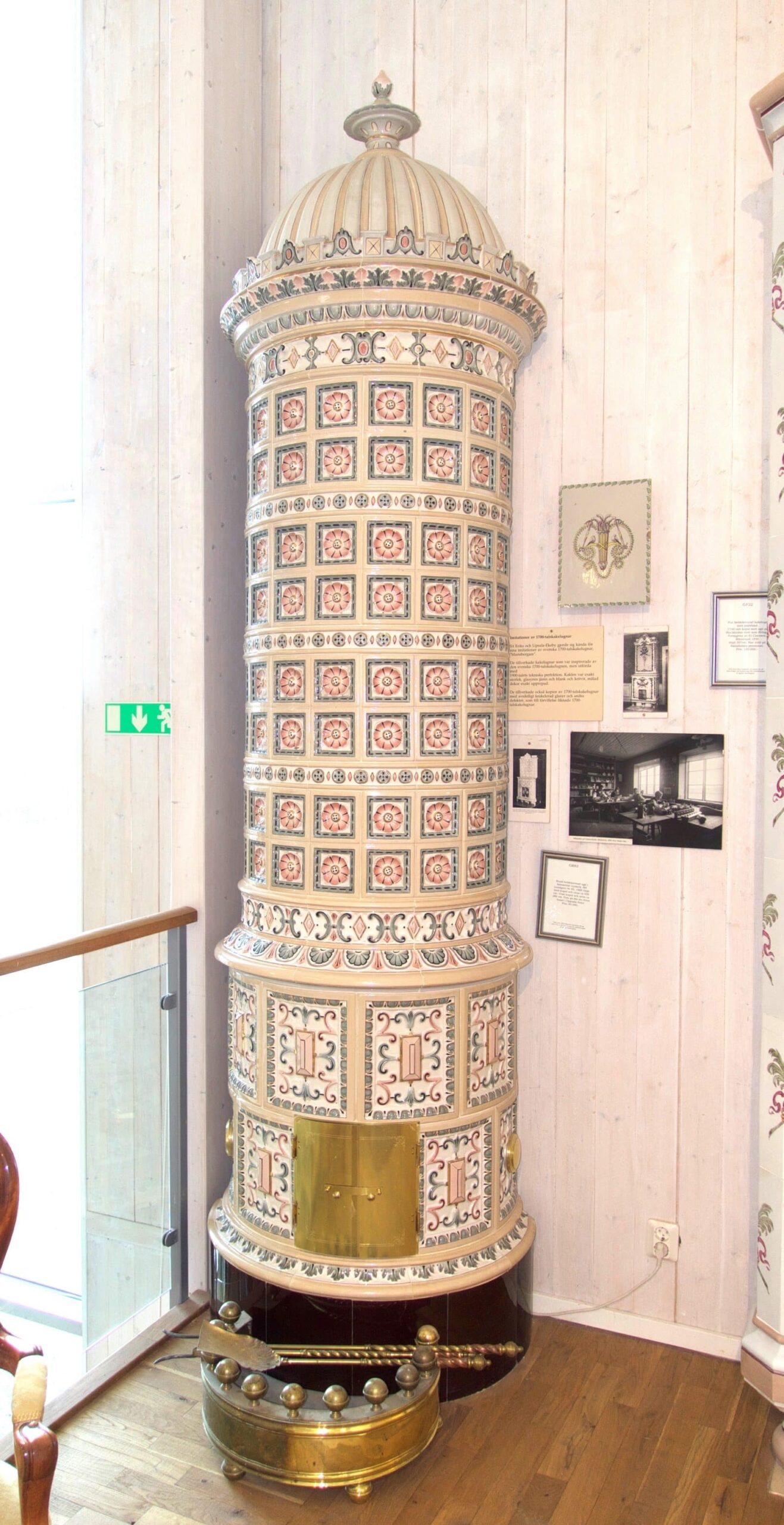 Rund heldekorerad kakelugn i fantastiskt nyskick med urna. Finns med i BH Lundgrens Kakelugnsfabriks priskurant 1888. Har stått på Dragarbrunnsgatan 75 i Uppsala. Med urna blir höjden 330, utan kupol och urna 280 cm. Finns uppmurad i vår utställning i Uppsala.