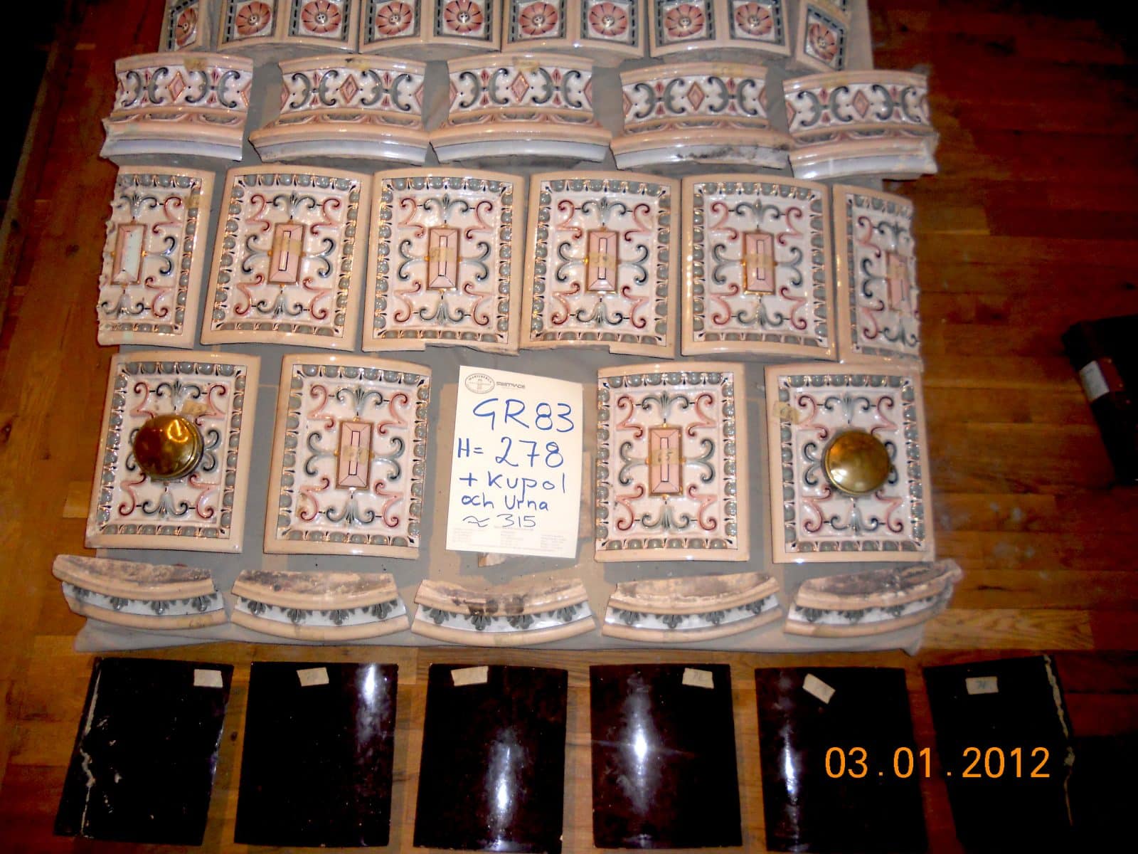 GR083 – Flerfärgad rund kakelugn med kupol och urna. BH Lundgren Nr 60