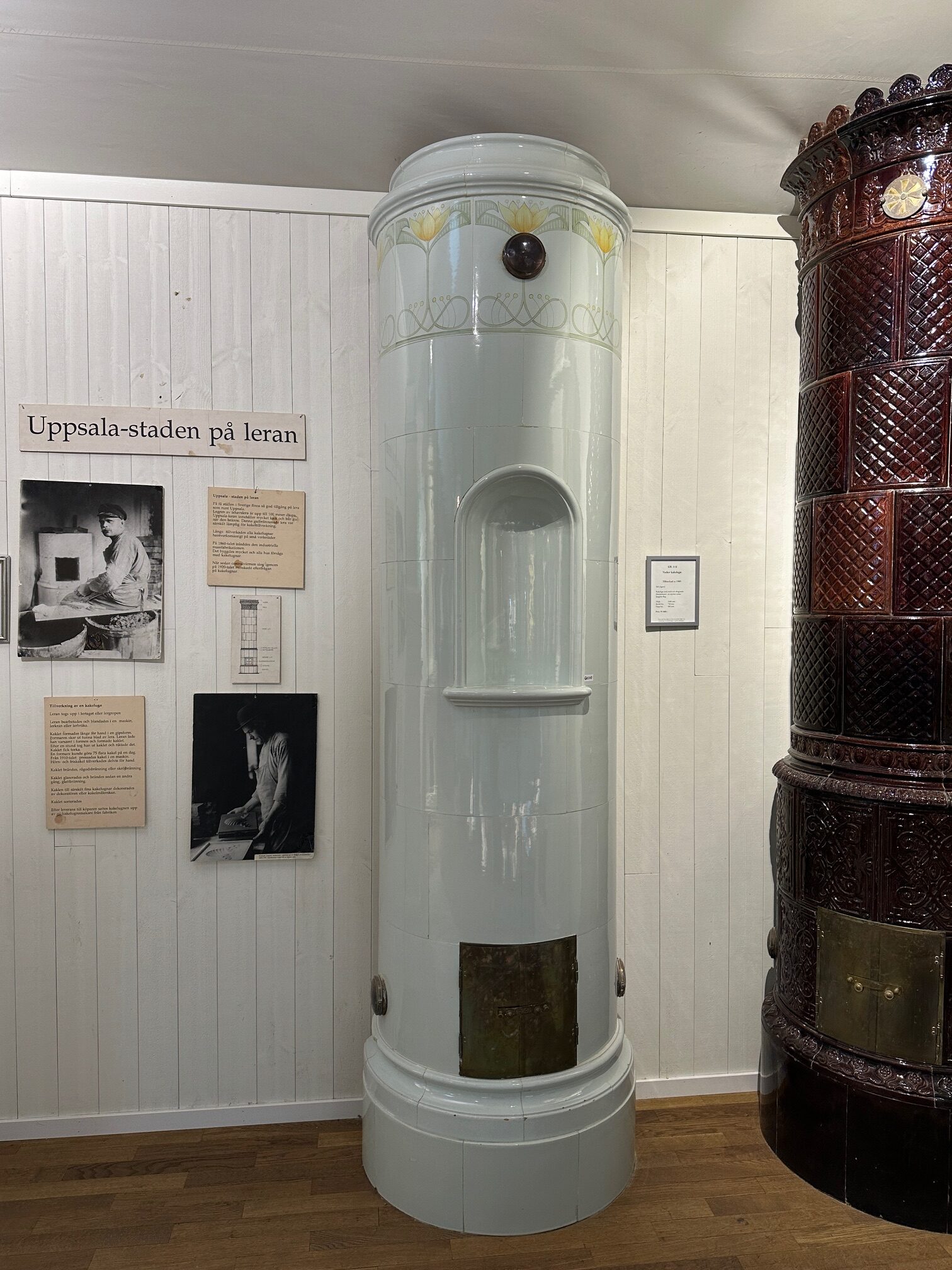 Jugend kakelugn med slingrande blommor och nisch. Ljusgrön glacyr. Finns uppmurad i utställningen i Uppsala.
