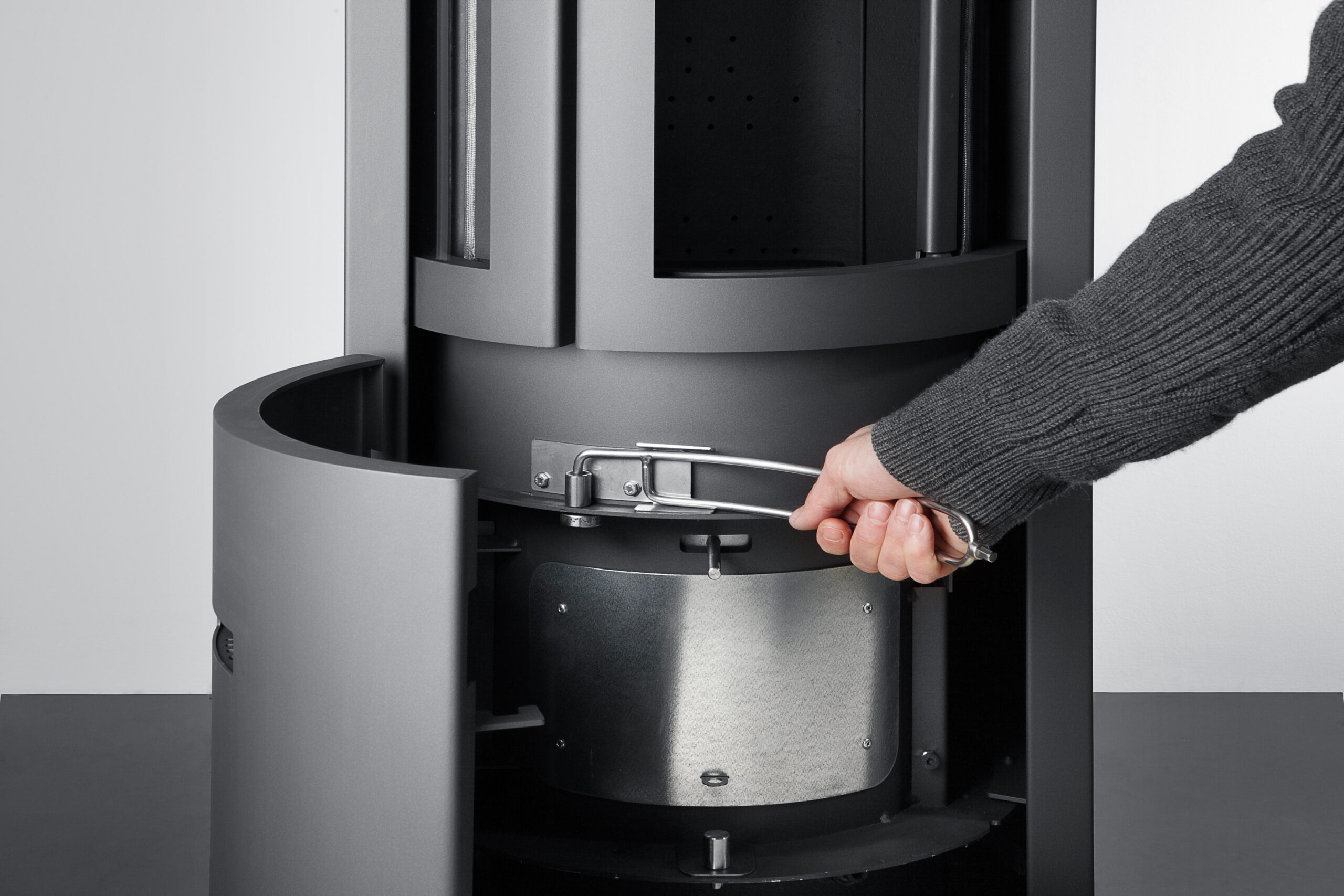 Täckt lucka: När kaminen brinner ut eller om du vill ha långsam, ekonomisk värme utan insyn, vrider du fram den solida dörren. Det ger ett stilrent, minimalistiskt uttryck och skyddar glaset.